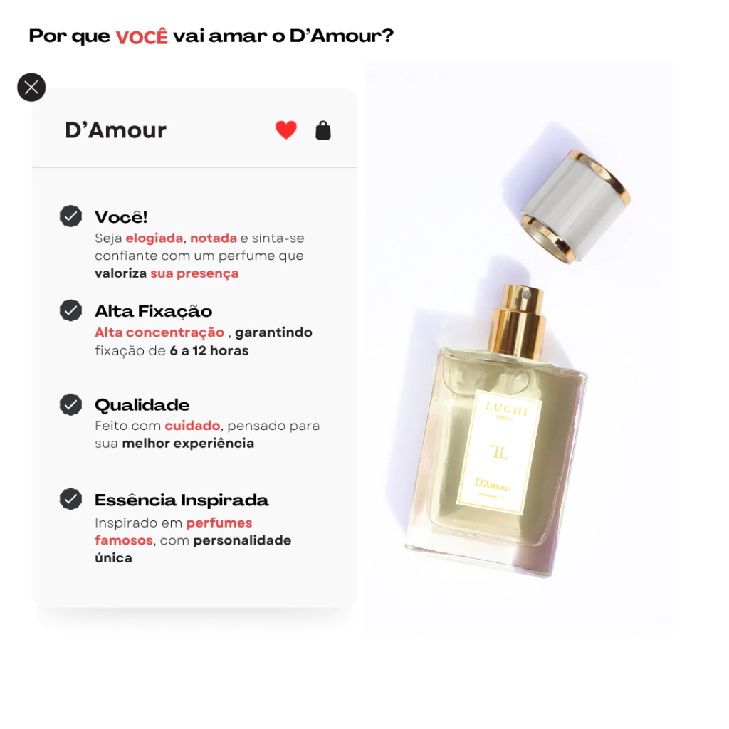 Criado pela Luchi Parfum, D’Amour possui alta concentração de essência, garantindo fixação prolongada de 6h a 12h, dependendo do pH da pele.