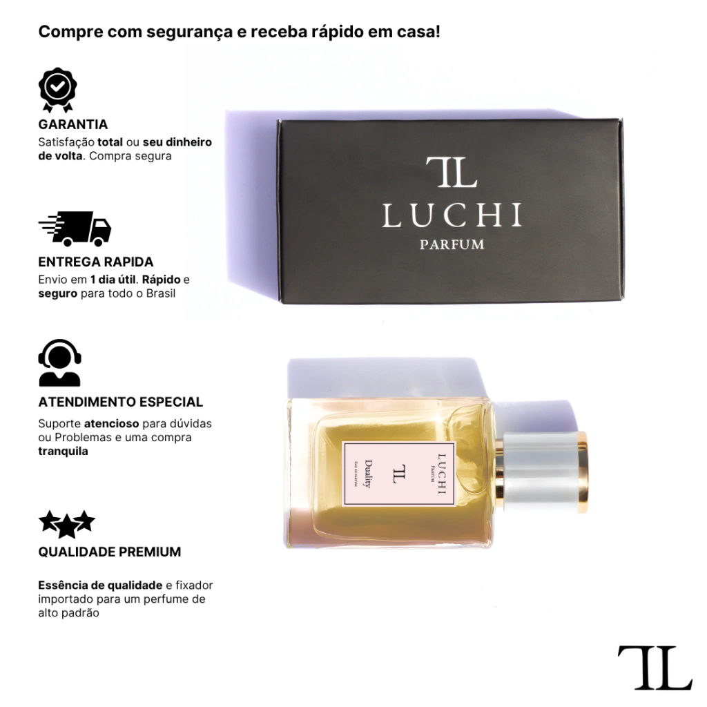 Duality é uma fragrância exclusiva da Luchi Parfum, sem vínculo com outras marcas. A menção a fragrâncias conhecidas serve apenas como referência olfativa, não representando cópia exata da original. Nossa proposta é oferecer uma experiência similar, com identidade e personalidade próprias.